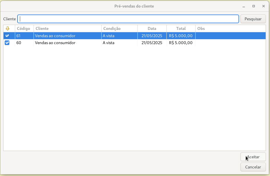 2 - Na tela de abertura de vendas, foi criada uma área especifica para o preenchimento das observações.