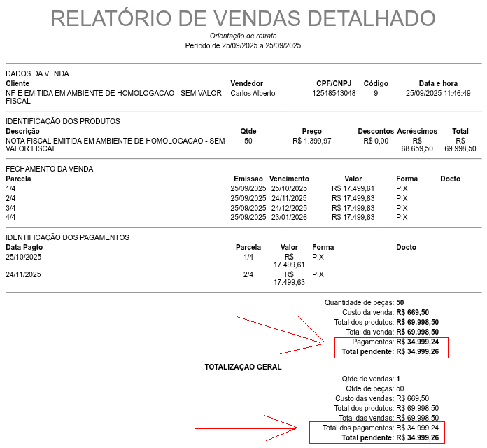 4 - Adicionado totalização de pagamento e totalização de contas pendentes no relatorio de vendas detalhado.